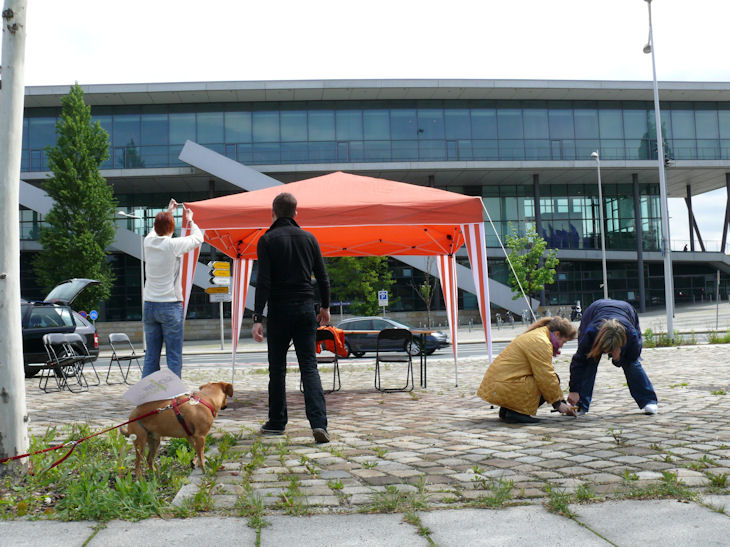 Zelt, Tische, Stühle, Banner, Informationsmaterial und Plakate